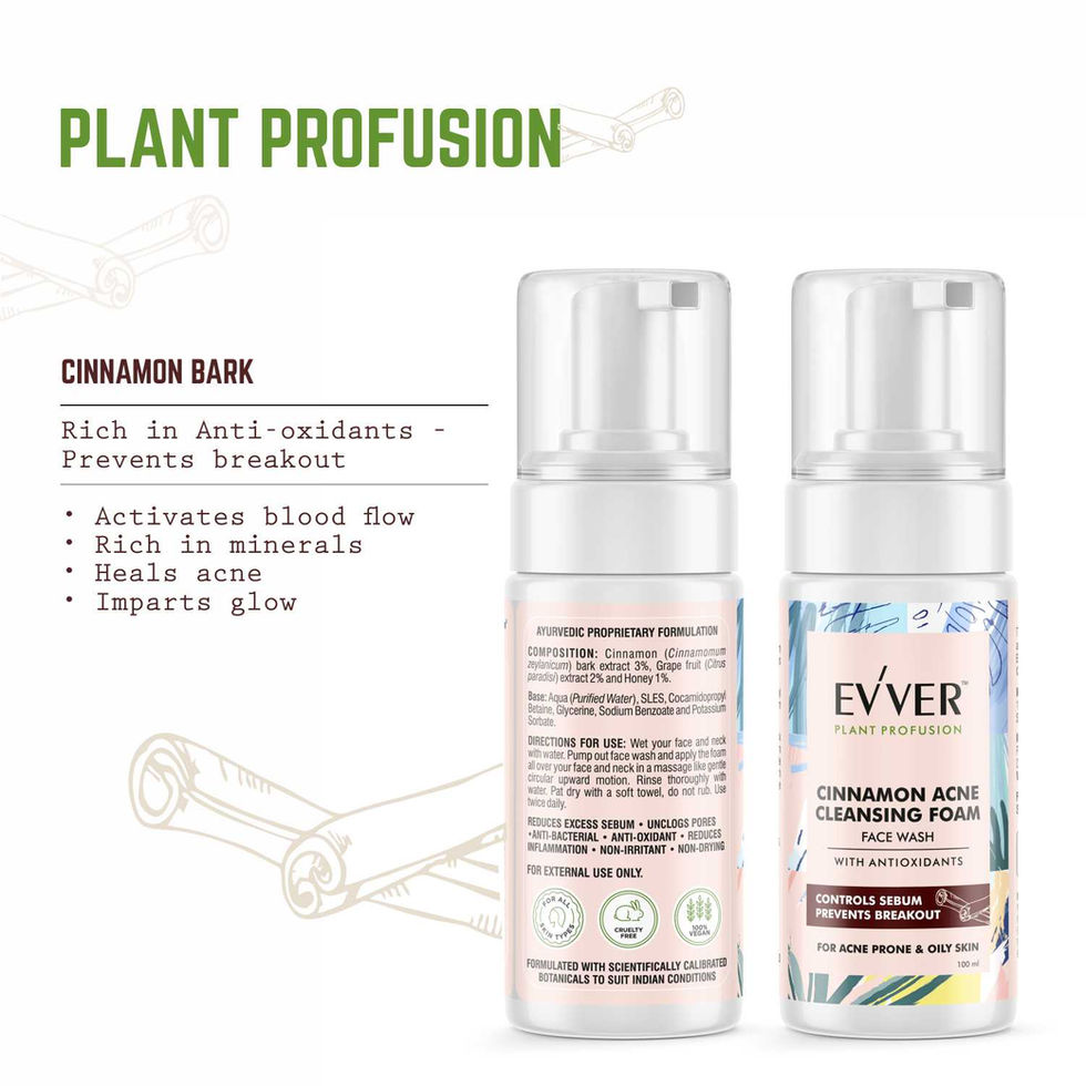 Evver Cinnamon Acne Cleansing Foam Facewash contains PLANT PROFUSION of Cinnamomum zeylanicum (Cinnamon) bark extract, Citrus paradisi (Grapefruit) extract and honey.