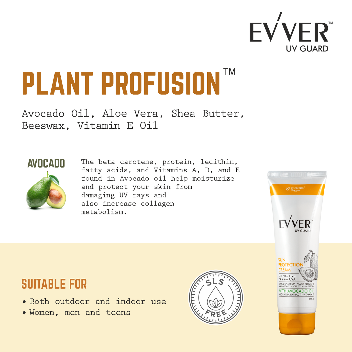 EVVER UV GUARD SUN PROTECTION CREAM is an advanced sunscreen formulation with Plant Profusion which provides broad-spectrum protection against skin-aging and skin-burning sunrays. It protects the skin from sun burns, spots and tanning. This soft-feel sunscreen is balanced with natural oils and extracts of Avocado, Aloe Vera and Shea Butter, which also nourish the skin and remove tan. Polyhydroxylated Fatty Alcohols (PFA) in Avocado Oil also repair damaged skin cells.